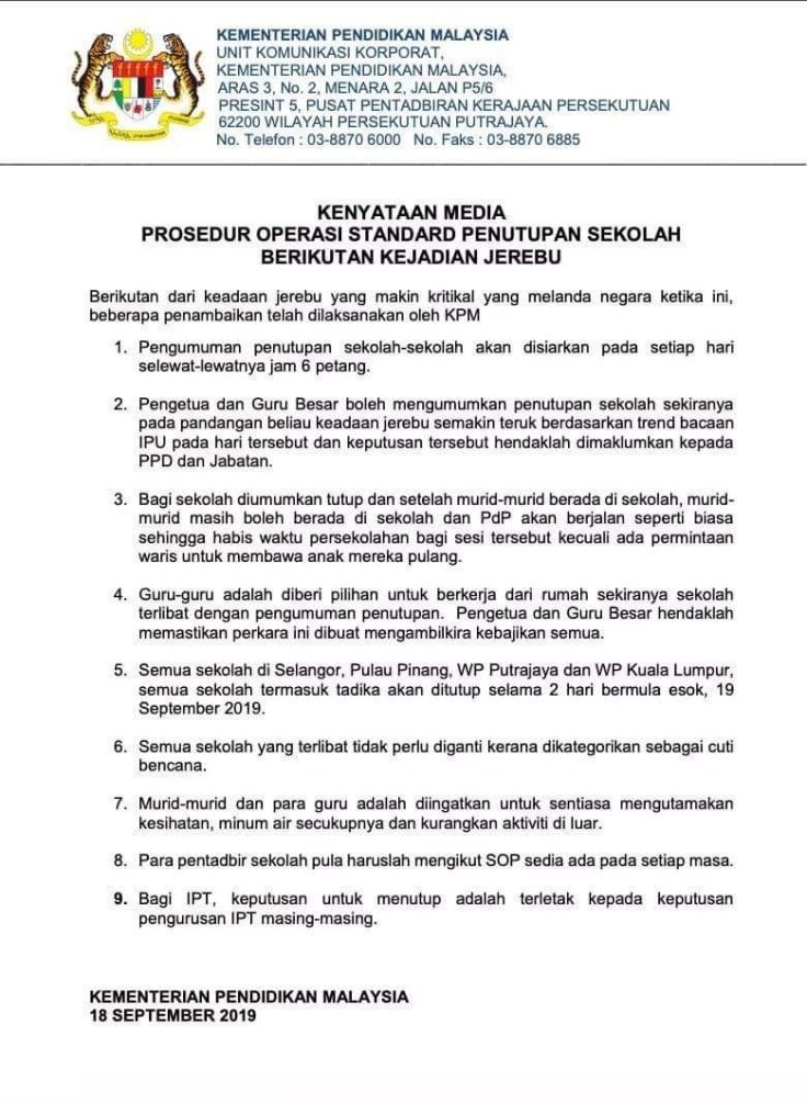 根据教育部长的最新宣布,槟州所有学校将于19.09.2019(星期四)及20.09.2019(星期五)停课两天。所有学生将不必到校上课。