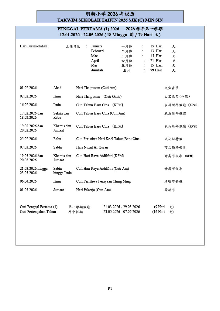 明新学校 SEKOLAH JENIS KEBANGSAAN (CINA) MIN SIN 86, JALAN TUN DR. AWANG, RELAU, 11900 BAYAN LEPAS, PULAU PINANG. Tel & Fax: 04-6422488