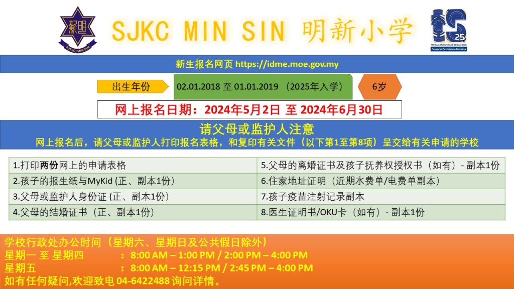 2025学年一年级入学申请将于 2024年5月2日至6月30日 开始开放线上申请,请家里有孩子要报读一年级的多加留意哦!